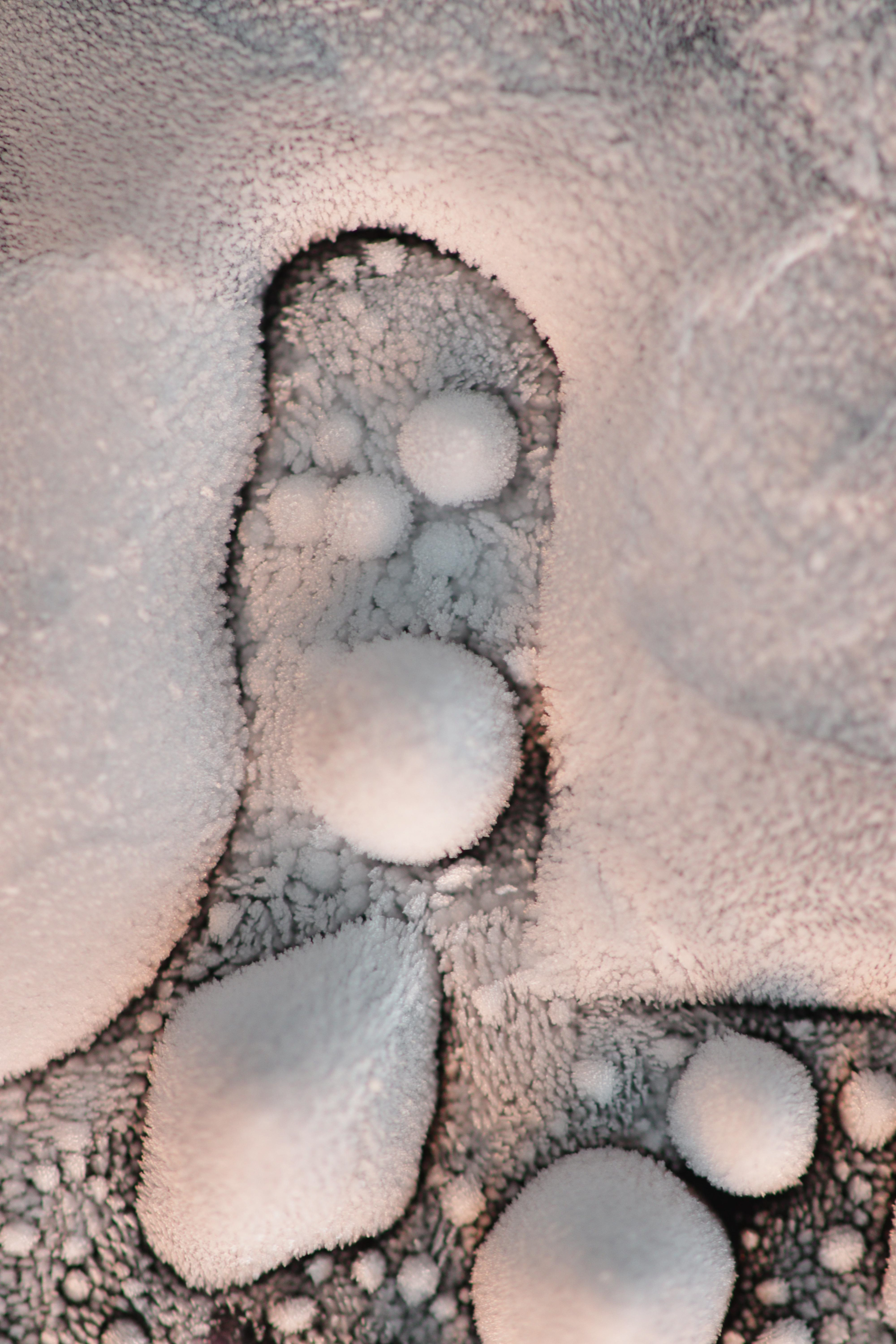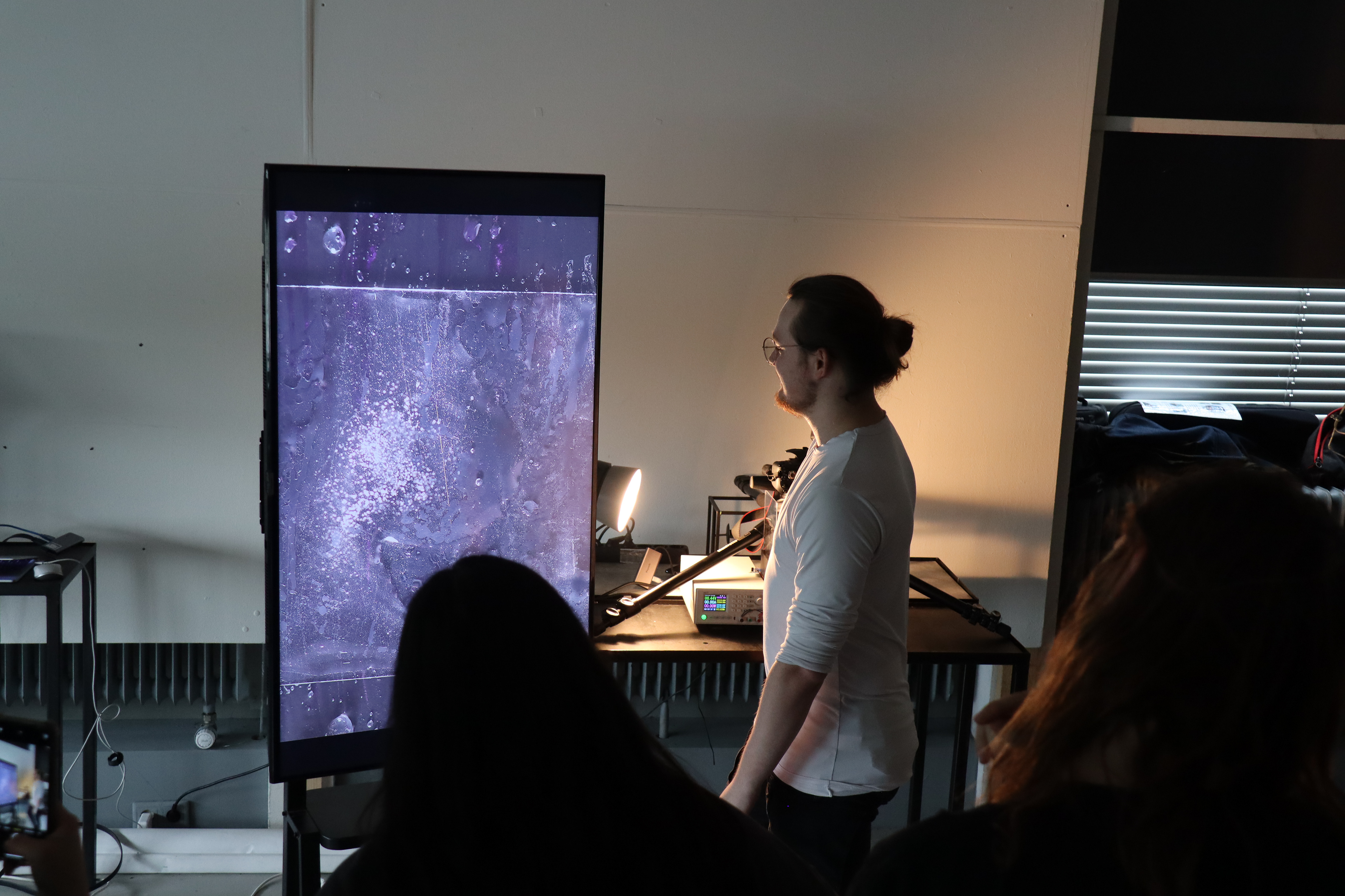 Nucleus is an installation exhibition in which the audience was requested to participate in controlling the temperature of a water droplet and the amount of moisture in the air. They could see live footage from a macro camera lens hanging above the installation and take pictures or videos of what they were seeing which would then be shown on screen. Controlling the amount of moisture and temperature of the water droplet would results in very different footage and crystallisation of the the "ice".